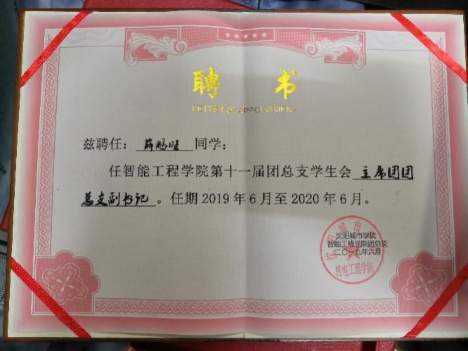 为了再次提升自己的思想觉悟和为能更好地全心全意为人民服务,他选择先服务身边的对象开始做起。在19年6月他参加智能工程学院第十一届主席团公开选举,被选聘为智能工程学院团总支副书记。在任期间,认真履行职责,努力带领全体学生会成员为同学们服务,目前共开展过多达将近50次活动。每次团委活动的开展都是对他的综合能力的一次锻炼,曾荣获过优秀团学干部、沈阳市优秀共青团员等荣誉,他坚信这是对工作成绩最好的证明。终于在19年12月5日,他成为了一名光荣的预备党员,作为共产党员愿意将他的终身都奉献给建设共产主义伟大的事业中去。