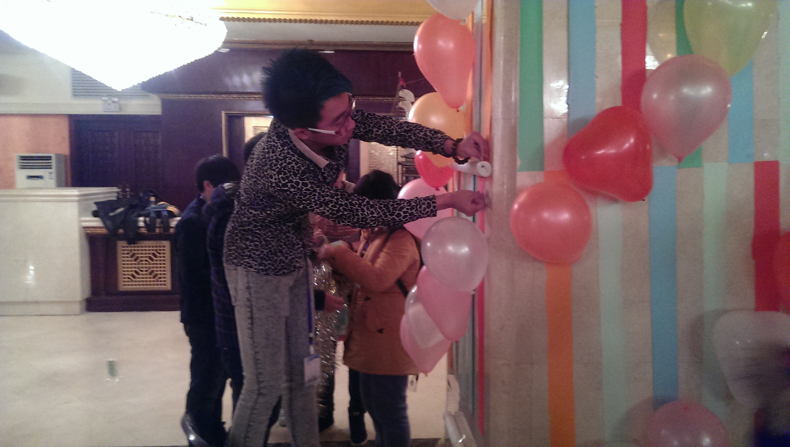 下午1点整,我院所有学生会成员到俱乐部宴会厅集结完毕,待负责人分配完任务后便忙碌起来。各部门都积极投入进来,从舞台粉饰到桌椅摆放,从条幅悬挂到地面清扫,专注着每一个细节。女生用彩纸、气球等将现场进行装饰和美化,将现场烘托出青春欢快的氛围;男生男生将重达几百斤的T台和嘉宾看台搬到现场,并放在指定位置,与环形观众席交相辉映,巧妙结合为一个新颖创意的会场排布。技术人员,也将音响、投影仪、灯光等做了细致的检查,后台负责人将演员服装、道具进行分类摆放,以方便晚会流程更加通畅。为了保证现场能够随时调整,大家也是轮流到楼下简单就餐,随后便继续投入工作,虽然辛苦,但每个人脸上都挂着奉献的笑容。