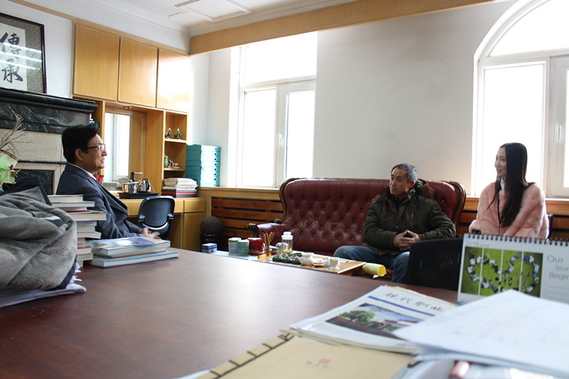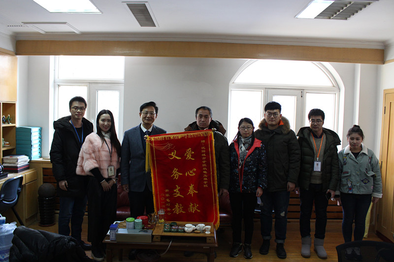 本网讯(机电工程学院柏建鹏)12月23日下午2点,沈阳市法库县双台子乡关家屯村村书记王晓峰在雪天路滑的情况下从法库县出发历程112公里,历时3个多小时,跨越了整个沈阳市,给沈阳城市学院送来了感谢锦旗,以表示对我校机电工程学院青年志愿者协会每年寒暑假都去关家屯村开展支教活动的由衷感谢,校党委书记孙永新对王晓峰一行人的到来表示欢迎并接受了锦旗,双方亲切交谈。