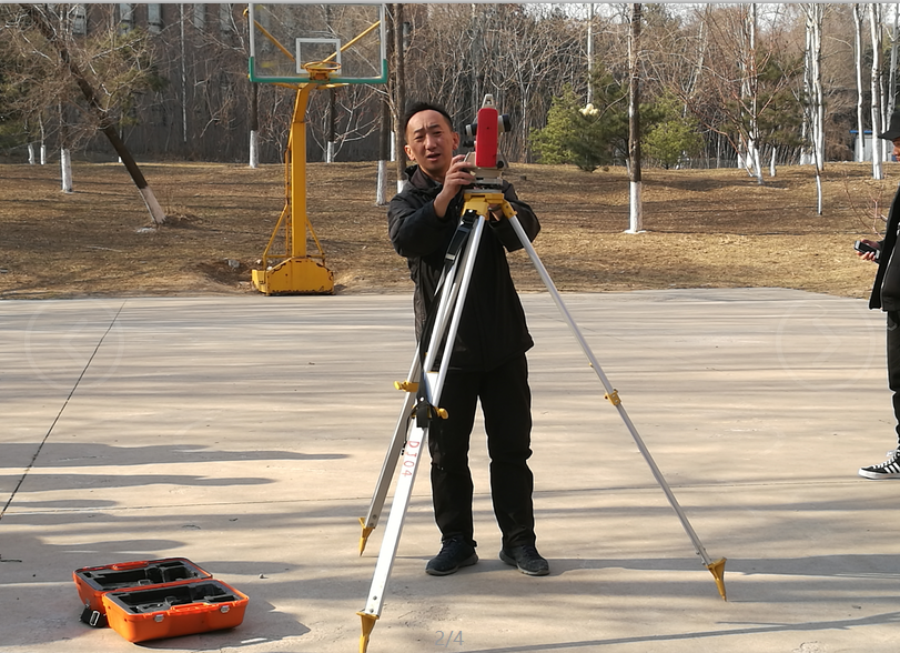 实践前,老师向大家展示了经纬仪的构造并介绍使用说明,详细阐述了水平角、竖直角和视距测量的观测方法及记录、计算等操作要领。他提到,“对中、整平、瞄准、读数”这八个字是使用经纬仪的关键。讲解过后,同学们积极探讨使用方法,利用所学知识进行现场测量实践,并在实践中熟悉仪器的操作步骤。在动手操作的过程中,土木三班张书铭同学对于调节精平与粗平的方法不是很熟练,朱老师讲解道,调节水平的过程中,一定要注意水准管轴线与仪器竖轴线保持垂直。
