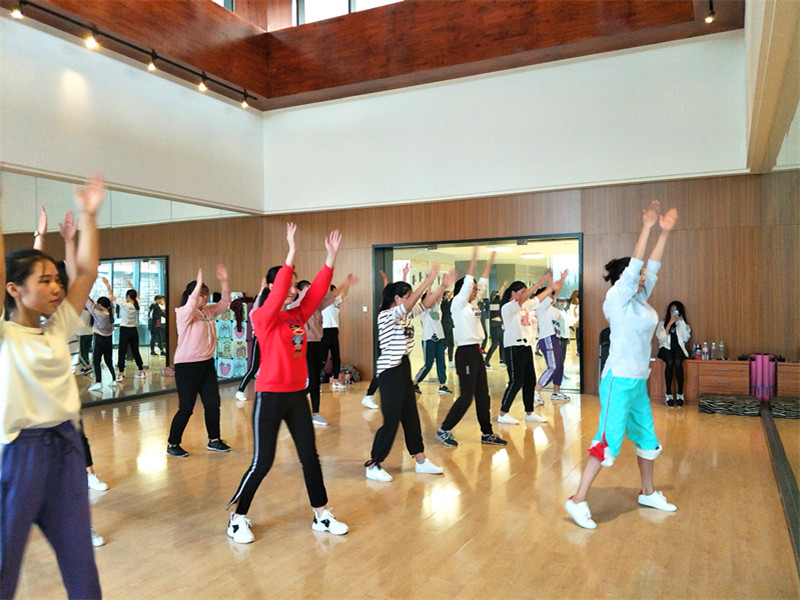 动作练习完毕后就是跟着音乐一起跳,音乐是快节奏的,而动作刚开始学习还不太熟悉,所以大一的同学们很犯愁,但大家都非常努力的在跟着音乐一起跳,老师也带领着大家一起跳,短时间内已经初见成效。虽然学习时间很短,学习内容多、难度大,但大家都没有放弃,依旧很认真的在练习,争取能够做到最好,这就是健美操姑娘们的精神,决不放弃,积极向上。