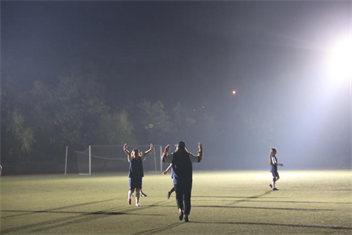 从日出的早操,到黄昏中的比赛,到日落灯光亮起,依旧阻挡不住双方相较的气势!足球在场地上划过完美弧度,最终以更完美的姿态摄入球门!对方队伍激动举起双手相击,张开双臂相拥!