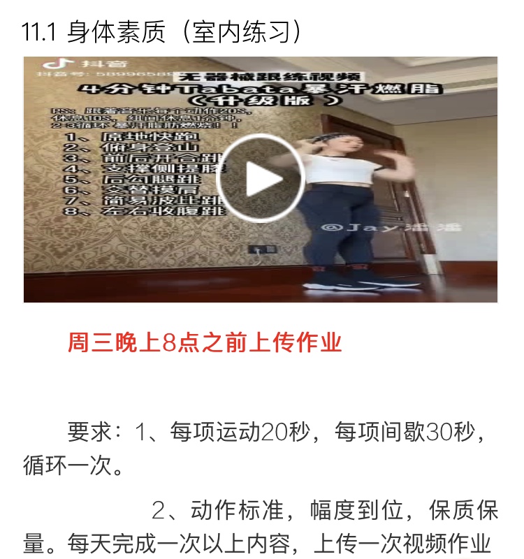 本周的女足俱乐部要求完成的视频非同凡响。而这一次,女足俱乐部推出“减肥燃脂”主题的运动,深受广大女足同学的喜爱。身体素质练习视频早已已经不单单针对足球运动进行锻炼,而是更多的偏向于减肥健身。漫长的假期,个别学生在家都会坚持跑步、锻炼、做瑜伽,录制作业的同时也锻炼了身体。在这一周,女足俱乐部新增燃脂运动,让女同学锻炼身体的同时可以练出好的身材。