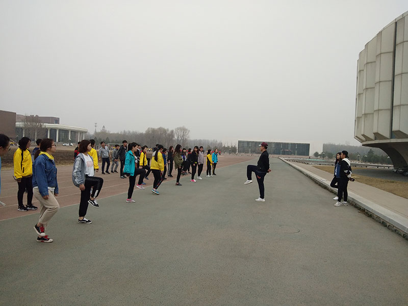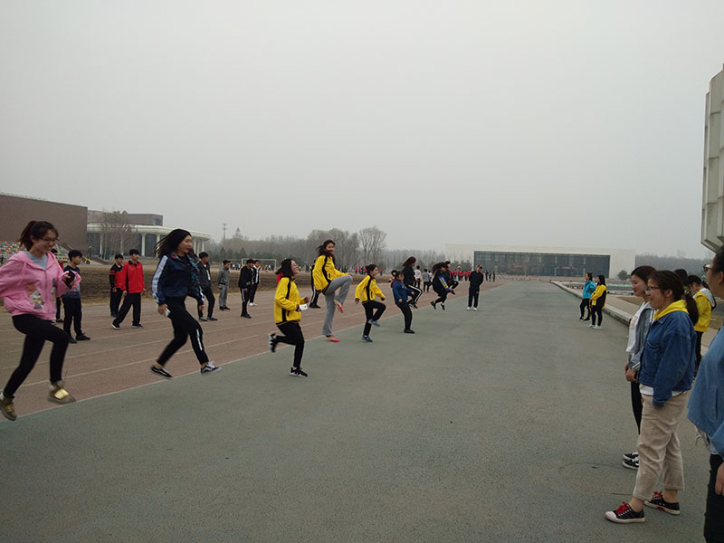 随后第二步将助跑与起跳与之前所学的联系起来,我们在一条长长的跑道上,分为每组四人,老师和小队队长耐心的一步一步教导我们标准的动作,指导我们姿势尚不准确的地方。