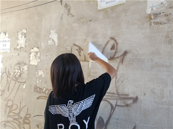 在本次活动中,同学们发现墙上乱贴的广告和地上脏乱的纸削,小区内满地的纸片、塑料袋和烟头等,令人触目惊心。在董静老师的带领下,大家纷纷开始捡垃圾、清理脏污和揭掉满墙的小广告,并对白色污染物和废电池进行了分类处理。