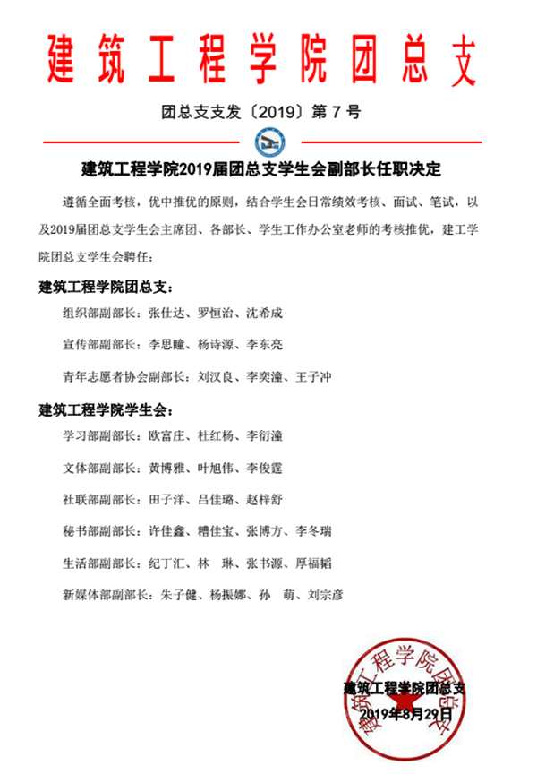 最后,经过全面考核,优中推优,结合学生会日常绩效考核、面试、笔试,以及2019届团总支学生会主席团、各部长、学生工作办公室老师的考核推优,建工学院团总支学生会最终聘任张仕达等3人为组织部副部长;李思瞳等3人为宣传部副部长;刘汉良等3人为青年志愿者协会副部长。欧富庄等21人被聘任为学生会各支部副部长。