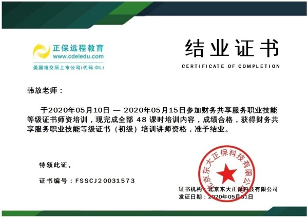 本网讯(商学院 马建国)5月10日,商学院会计系、金融系、工商系和财经系20名教师参加了由北京东大正保科技有限公司举办的“1+X财务共享服务职业技能等级证书”第三期师资培训。培训共历时六天,商学院20名教师全部通过结业考核,获得财务共享服务职业技能等级证书,其中会计系教师张逢源取得了98分的优异成绩。
