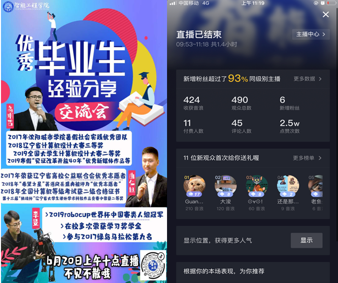 智能工程学院直播“奋斗青春最美丽”毕业生经验分享会,获2.3万点赞量