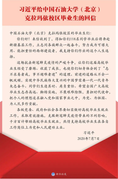 本网讯(校团委 赵嘉琪)中共中央总书记、国家主席、中央军委主席习近平7月7日给中国石油大学(北京)克拉玛依校区毕业生的回信中,肯定了他们到边疆基层工作的选择,也对广大高校毕业生提出了殷切期望。为此,我校2020年西部计划志愿者组织开展了学习活动。