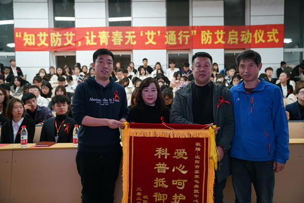 活动最后,由胡家鑫老师为特邀嘉宾赠送锦旗并与全体同学合影留念。本次防艾启动仪式中参与同学认真聆听,了解到很多与艾滋病相关的知识。不仅让同学们增加对艾滋病的正确认识,更是为今后的健康文明的生活有着重要意义。