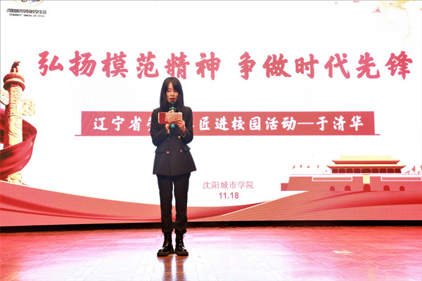本网讯(校团委 杜昕宇)为发挥模范人物的榜样示范作用,以劳动模范事迹引领学生学习劳模精神,近日,沈阳城市学院校学生会宣讲团在绿岛讲堂举办了以“弘扬劳模精神,争当先进模范”为主题的模范人物进校园讲座。邀请全国五一劳动奖章获得者——建设银行阜新分行开发区支行负责人于清华,与商学院学生进行面对面交流,分享他的工作故事,传承劳模精神。