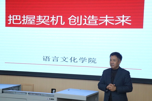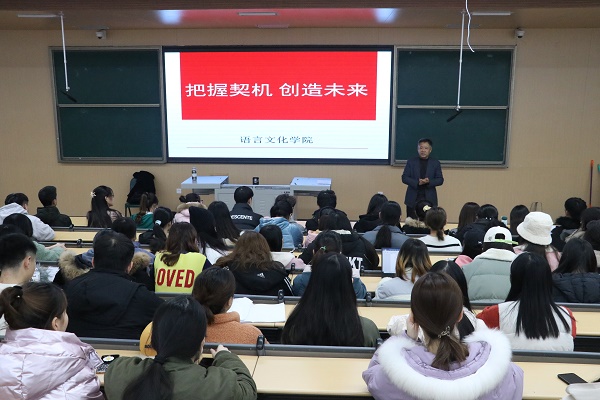 本网讯(语言文化学院 刘青越 沙莹莹 董雯静)为提高学生专业素质,使学生有能力通向更高的平台,沈阳城市学院语言文化学院于近日召开了专业指导讲座,该院院长赵慧平主讲,各专业教师及2018级全体学生一同参加。