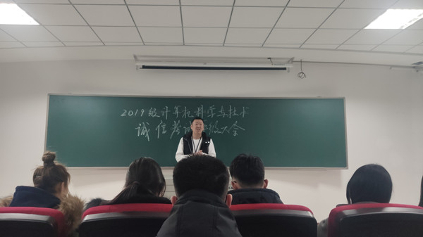 本网讯(智能工程学院 李浩南)临近期末,为了让同学们严肃对待英语四六级及期末考试,进一步明确考场纪律,智能工程学院计算机系主任李朋于12月7日为18级全体同学进行诚信考试教育,随后学业辅导员鞠现银于12月8日、9日下午在机电楼分别为19级、20级同学宣讲考试纪律,提醒同学们遵守学校关于考试的相关规定。