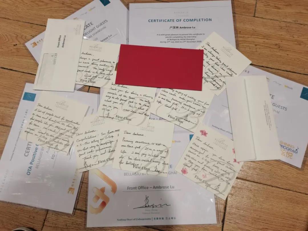 卢国林的实习岗位是礼宾部行李员,他说:“ 不知不觉六个月的实习结束了。在刚入职一个月的时候,我便相继得到了20余位客人的好评,并受到总经理的表扬。和总经理的谈话让我受益良多,也更加坚定了我未来发展的方向。在实习过程中,我学会了如何与同事相处,如何与客人更好的沟通,如何能够在最短的时间完成效率最高的事情。实习的时间虽然短暂,但我相信每次告别都是新的开始,每次经历都是一段成长,感谢相遇,未来可期!”