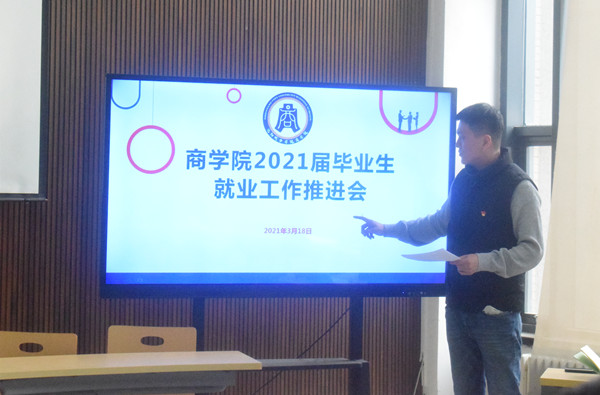 本网讯(商学院 吴佳惠)为深入推进2021届毕业生就业工作,鼓励并帮助毕业生顺利寻找工作,商学院于近日在经管楼召开“2021届毕业生就业工作推进会”,会议由学办主任邹全主持,院长金永利、副院长芦丹及专业系主任、辅导员、毕业班班主任共同参加会议。