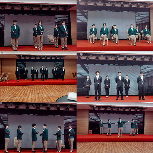 小组礼仪操本着一切原创的要求,巧妙地将组内成员的意见和课上所学的知识结合,自主编排了一套套新颖的礼仪操。经历了一个月的认真排练,同学们既紧张又兴奋,大家都期待着礼仪操的完美呈现。汇报由小组成员进行抽签排序,确定顺序后每个小组都有相应的准备时间,让同学们认真检查自己的服装、音乐和道具。一切就绪后正式开始汇报流程,姜旸老师逐一检查小组成员的仪容仪表是否合乎职业礼仪的规范,并就此为个人打分。