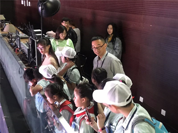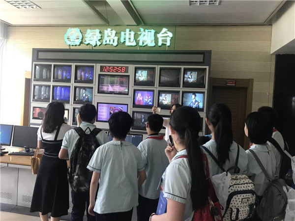 中午,四十余名小学生记者在我校西山会所就餐完毕,并与校记者团领队集合分为四队进行参观。首站来到传媒楼。四队依次走进绿岛电视台及传媒楼一楼演播大厅,各演播厅配备了专业广播级高清摄录采集系统、数码影视后期制作系统、全自动硬盘播出系统及多讯道导播系统和灯光声控处理系统。综艺演播实验室配置有现代化数字灯光音响设备和功能齐全的舞台配套系统。小记者们认真观看了“一本书传递一份爱”的读书漂流活动的现场录制,绿岛电视台台长宋威向同学们介绍了演播大厅的设备及录制注意事项,随后小学生们安静的在一楼观众席观看,近距离体验舞台的魅力。